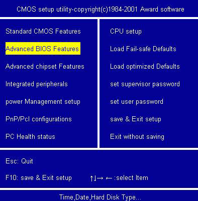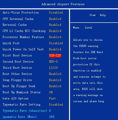設(shè)定為USB-ZIP,第一,設(shè)定的方法是在該項(xiàng)上按PageUP或PageDown鍵來轉(zhuǎn)換選項(xiàng)。設(shè)定好后按ESC一下,退回BIOS主界面,