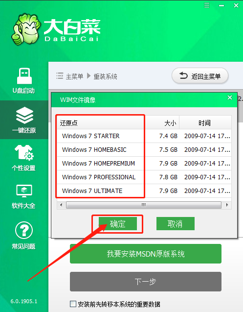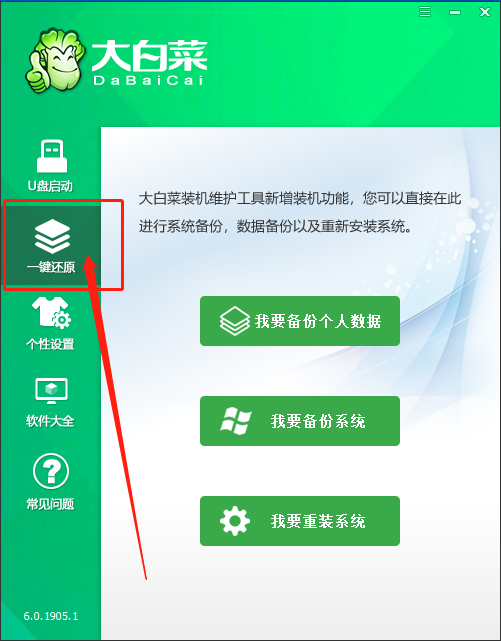 1、同樣打開并進入大白菜U盤啟動盤制作工具【一鍵還原】界面