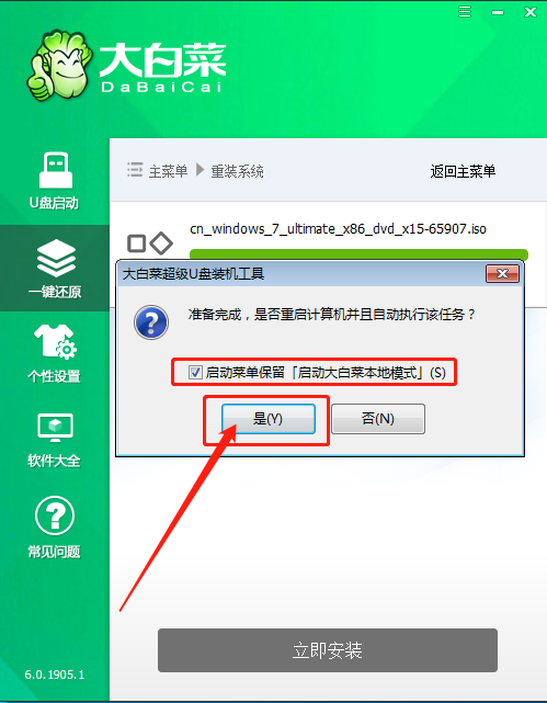 5、電腦會自動進行系統(tǒng)重裝準(zhǔn)備,出現(xiàn)彈窗提示時,點擊【是】即可。另外,根據(jù)具體情況,自行選擇是否保留啟動大白菜本地模式