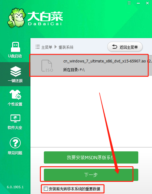 6、隨后,軟件會自動搜索鏡像文件,選中并點擊【下一步】。如有需要,可以勾選安裝前轉(zhuǎn)移本系統(tǒng)的重要數(shù)據(jù)