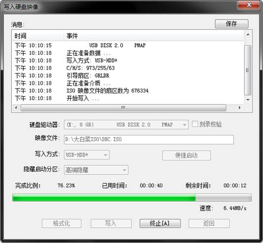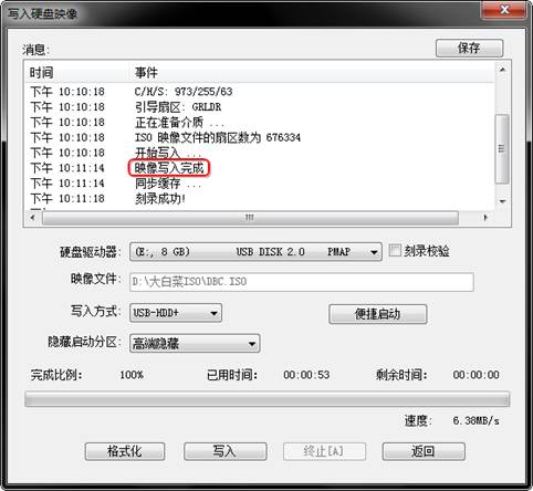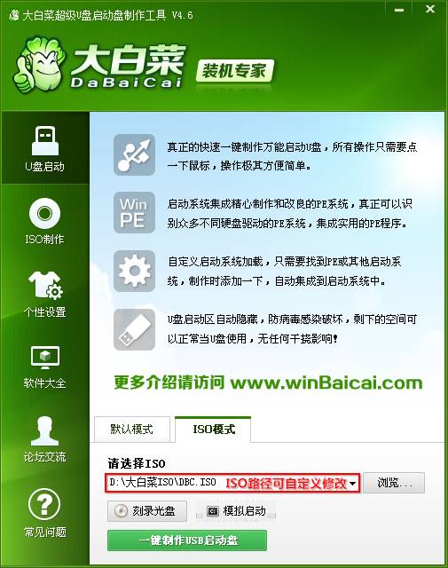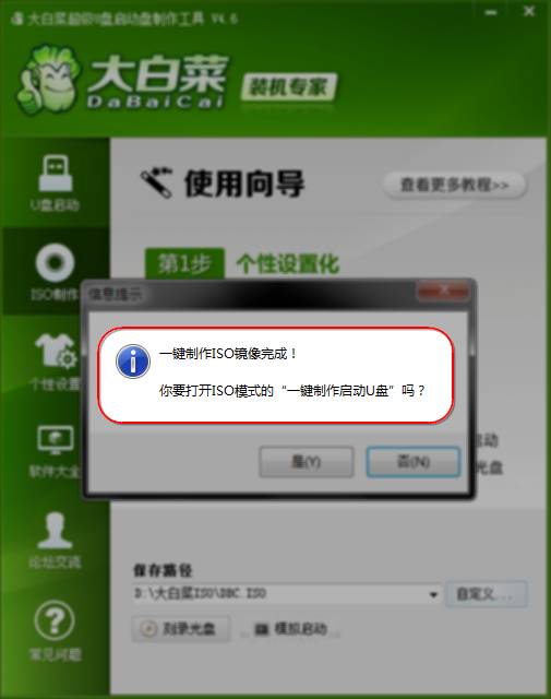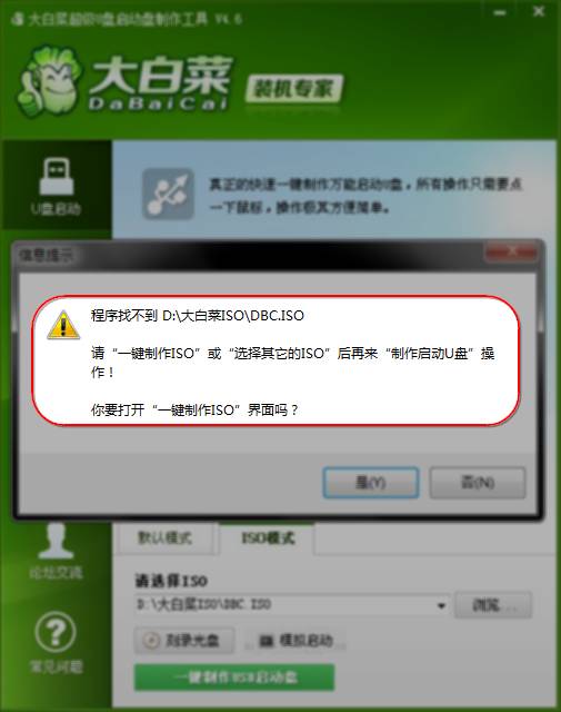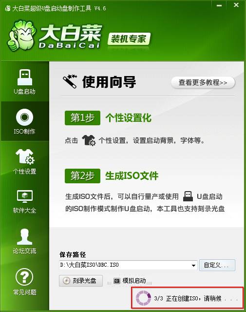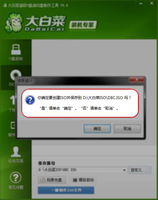 ISO模式2.2:點(diǎn)擊按鈕后程序會(huì)在“D:\大白菜ISO\”文件夾下創(chuàng)建DBC.ISO鏡像。