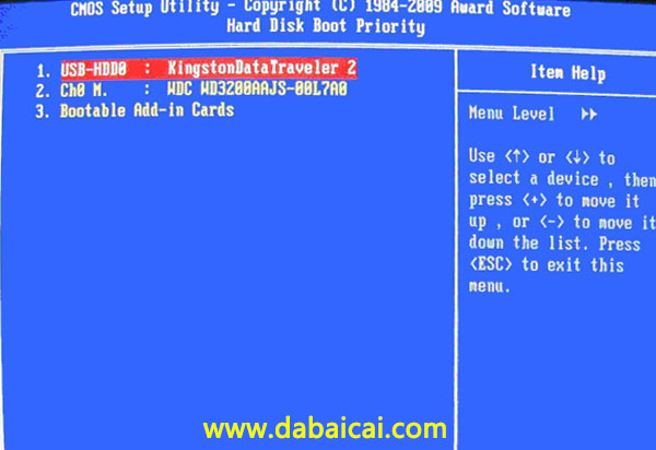 上圖3:硬盤啟動優(yōu)先級(Hard Disk Boot Priority)選擇:使用小鍵盤上的加減號“+、-”來選擇與移動設(shè)備,將U盤選擇在最上面。然后,按ESC鍵退出,回到圖2的設(shè)置界面。