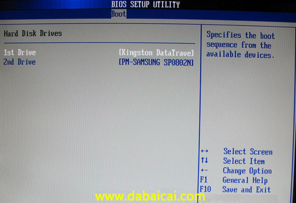 上圖3 硬盤驅(qū)動器“Hard Disk Drives”選擇:選擇U盤為第一啟動設(shè)備“1st Drive”