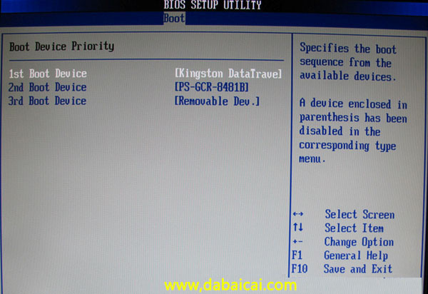 上圖2 :啟動優(yōu)先級設(shè)備選擇(Boot Device Priority)在第一啟動設(shè)備(1st Boot Device)里選擇U盤