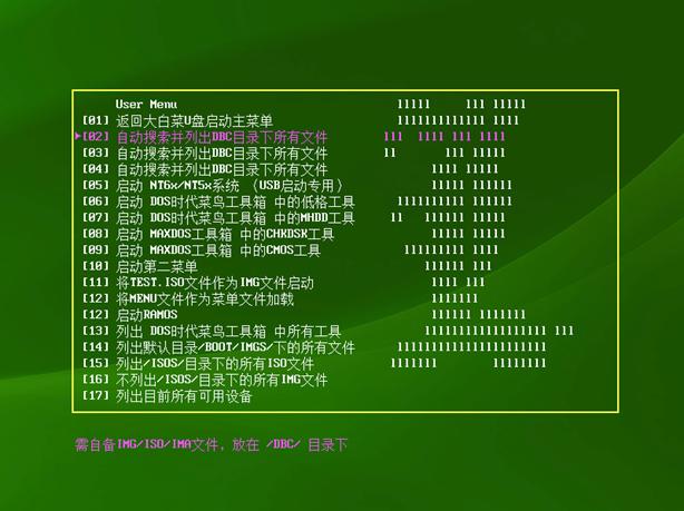 7、啟動(dòng)自定義ISO、IMG或IMA:按照之前的教程制作完U盤啟動(dòng),在U盤新建一個(gè)文件夾,將新建文件夾命名為DBC,將你需要啟動(dòng)的ISO或者IMG、IMA放入DBC文件夾內(nèi)。U盤啟動(dòng)后選擇第10項(xiàng)菜單然后再選擇菜單會(huì)自動(dòng)列出DBC目錄內(nèi)的所有ISO、IMG或IMA文件(注:不支持系統(tǒng)安裝ISO文件),按照編號(hào)選擇啟動(dòng)即可。