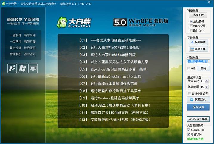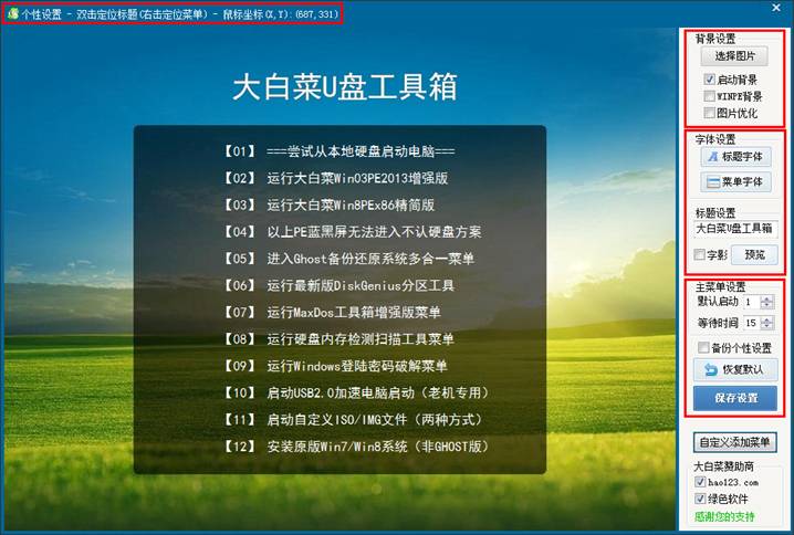 1、個性化設(shè)置:個性設(shè)置可以保存,一次保存方便下次使用。增加自動處理啟動背景圖片分辨率功能,另外特別增加自定義默認啟動項和進度條等待時間的功能。