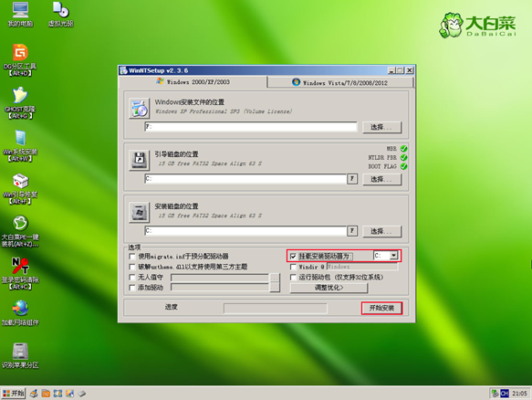 3、點(diǎn)選掛載安裝驅(qū)動(dòng)器為c:,然后點(diǎn)開始安裝。等待進(jìn)度條完畢提示重啟繼續(xù)后面的安裝步驟。