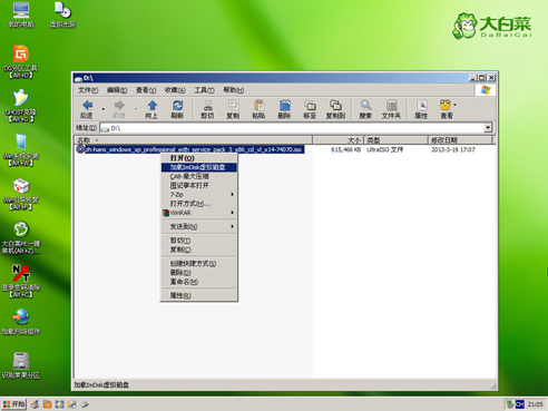 1、進(jìn)入第一個(gè)PE后找到我們事先準(zhǔn)備好的xp光盤iso鏡像,右鍵點(diǎn)擊加載虛擬磁盤(也可以利用虛擬光驅(qū)來加載或者直接用右鍵里的RAR解壓到本地硬盤分區(qū))