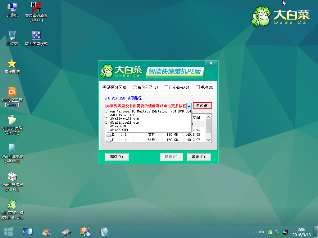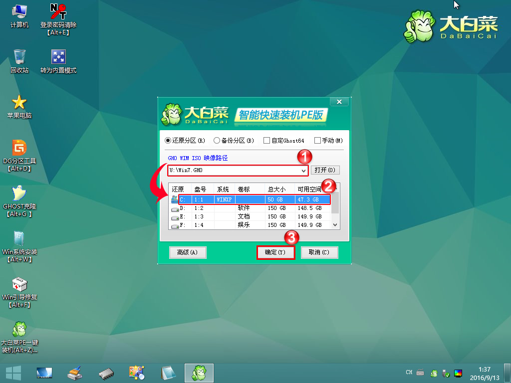 1-2:選擇需要進(jìn)行還原或者安裝的系統(tǒng)映像(如果選擇的是iso或wim文件會被自動掛載以供進(jìn)一步選擇),在磁盤列表中直接點擊選擇需要還原或安裝到哪個磁盤分區(qū)。點擊確定按鈕即可。