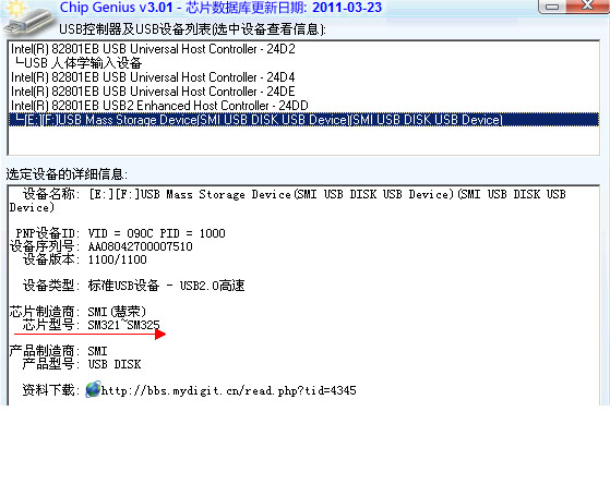 圖片上紅色箭頭上面的smi慧榮字樣,就是說的u盤的主控芯片。所謂的量產(chǎn)操作,也是要根據(jù)主控芯片選擇合適的量產(chǎn)工具。這個以后我們還會詳細的介紹。
