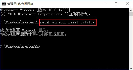 2、接著輸入:netsh winsock reset catalog 按下回車鍵,完成命令后重啟計算機即可成功啟用SENS服務(wù)。
