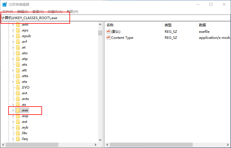 2、以可執(zhí)行文件.exe為例,定位到:HKEY_CLASSES_ROOT\.exe