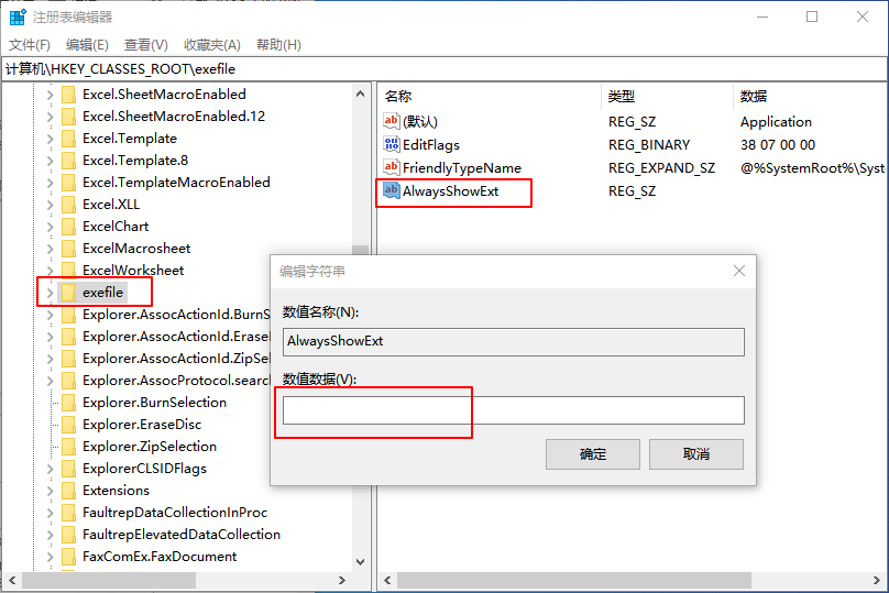 5、新建字符串值,命名為AlwaysShowExt,數(shù)值數(shù)據(jù)留空,最后重啟文件資源管理器即可;