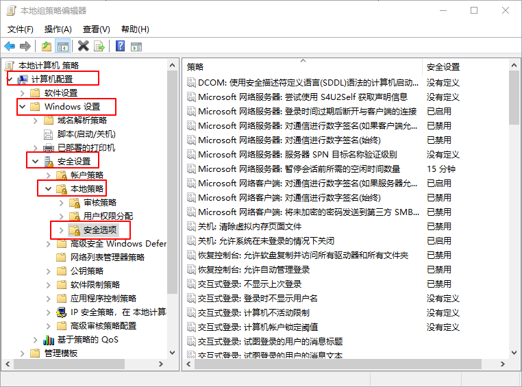 2、展開:計算機配置 → Windows設(shè)置 → 安全設(shè)置 → 本地策略 → 安全選項;