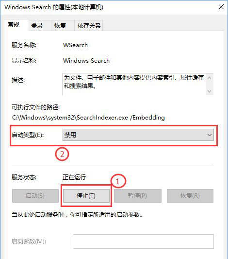 3、雙擊“Windows Search”服務(wù),打開(kāi)“Windows Search的屬性”窗口,點(diǎn)擊底部的“停止”按鈕,停止該服務(wù),然后把中間的“啟用類型”設(shè)置為“禁用”,確定即可