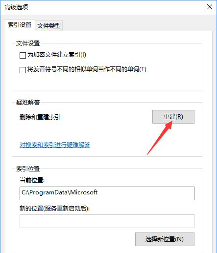 3、在高級(jí)選項(xiàng)窗口中有“重建”按鈕,點(diǎn)擊即可刪除和重建索引。