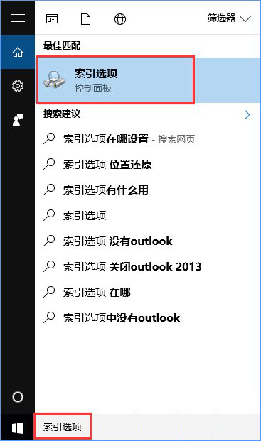 1、在Cortana搜索框中輸入“索引選項(xiàng)”,并點(diǎn)擊打開(kāi)“索引選項(xiàng)(控制面板)”;