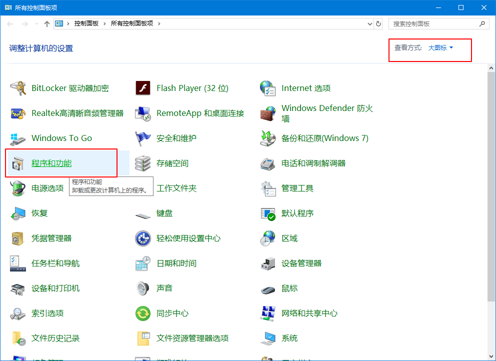 2、在控制面板中,切換至“大圖標”進行查看,點擊“程序和功能”