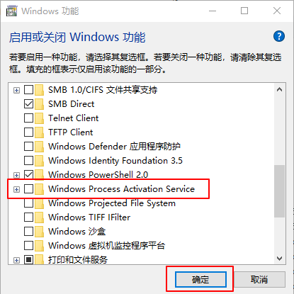 4、此時會彈出“Windows功能”窗口,勾選“Windows Process Activation Service”這一“組件功能”,點擊“確定”按鈕保存;