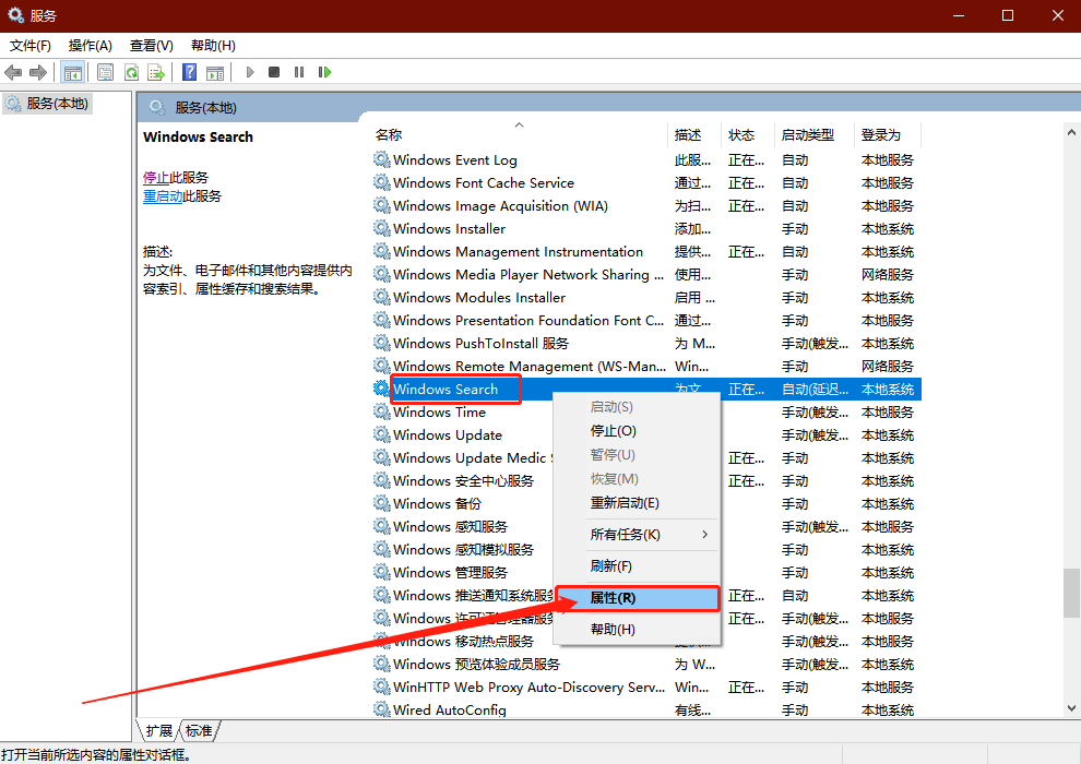 2、進(jìn)入服務(wù)頁面后,在右側(cè)頁面找到【W(wǎng)indows Search】,右鍵“屬性”