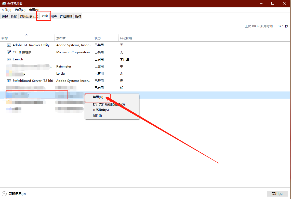 3、點擊并切換至“啟動”選項卡,右鍵不需要開機(jī)啟動的程序,選擇“禁用”即可