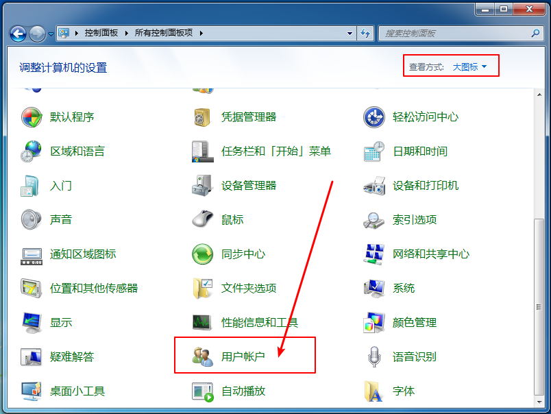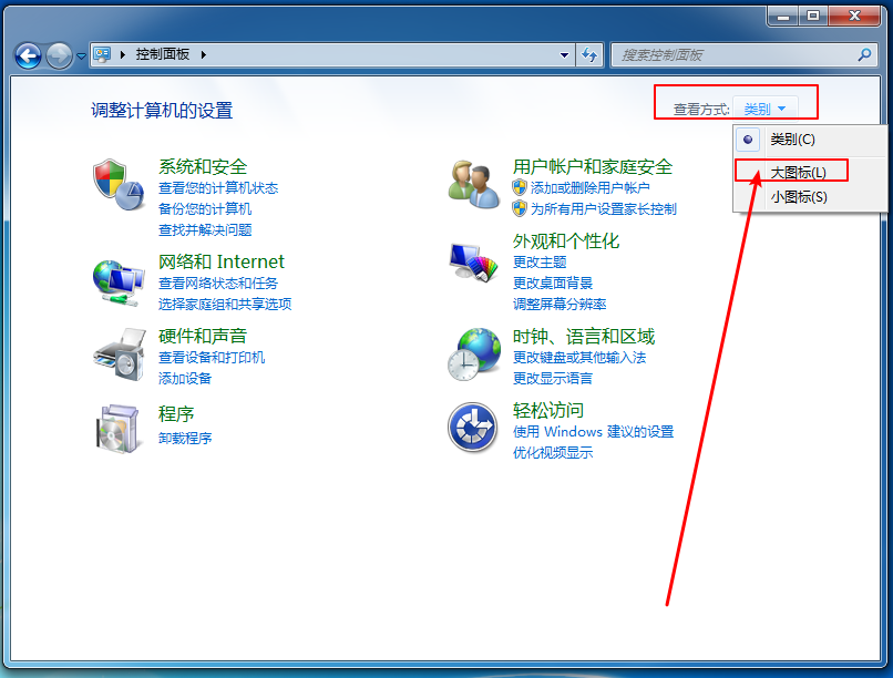 1、 進入控制面板后,修改查看類型為“大圖標”