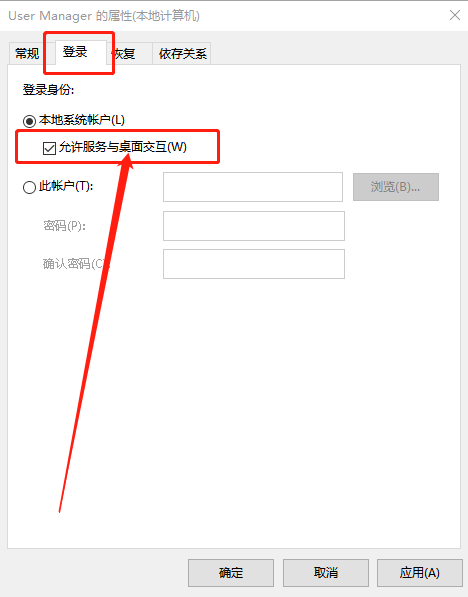 3、 之后,切換至“登陸”選項(xiàng)頁(yè)面,勾選“允許服務(wù)與桌面交互(W)”并點(diǎn)擊“確定”。