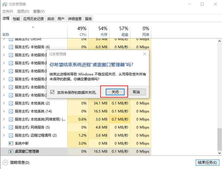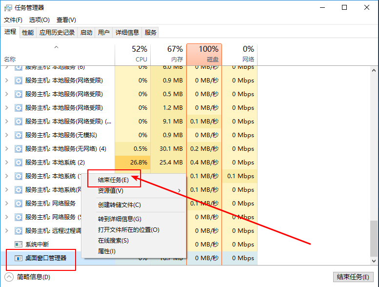 2、然后,在任務(wù)管理器頁(yè)面中,找到“桌面窗口管理器”,右鍵“桌面窗口管理器”,點(diǎn)擊“結(jié)束任務(wù)”。
