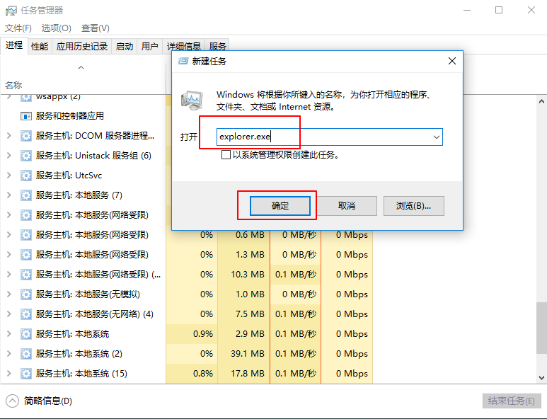 4、彈出新建任務(wù)頁(yè)面時(shí),輸入“explorer.exe”并點(diǎn)擊“確定”即可。
