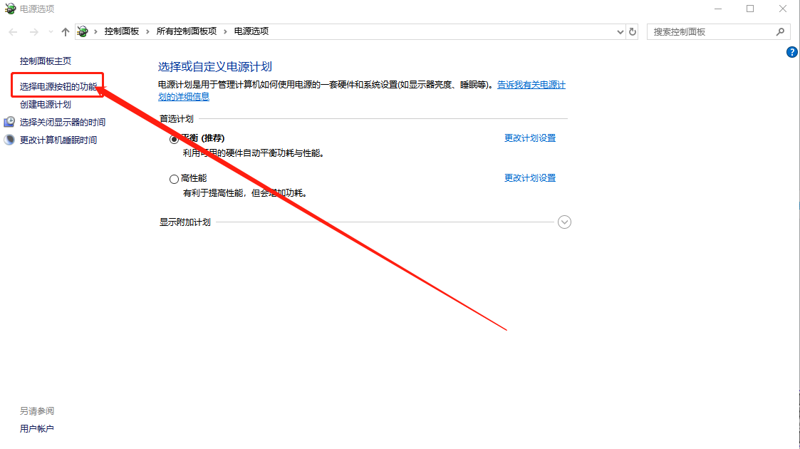 4、 在彈出面板中點(diǎn)擊“選擇電源按鈕的功能”