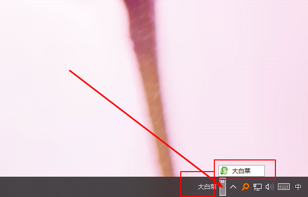 3、 之后,桌面任務(wù)欄就會出現(xiàn)“大白菜”文件夾的文字,點(diǎn)擊右側(cè)的小三角,還可以直接看到文件夾里面的內(nèi)容,并可以單擊打開