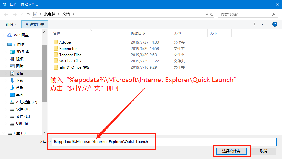 2、在新建工具欄頁面中,在“文件夾”中輸入“%appdata%\Microsoft\Internet Explorer\Quick Launch”并單擊“新建文件夾”