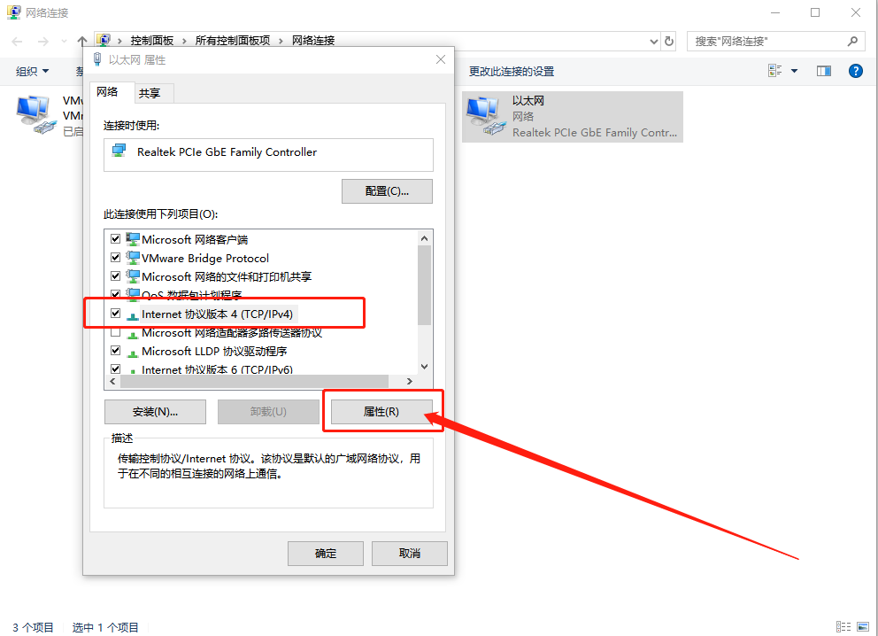 4、在以太網(wǎng)屬性頁(yè)面中,點(diǎn)擊選中“Internet協(xié)議版本TCP/IPv4”,然后點(diǎn)擊下面的“屬性”按鈕。