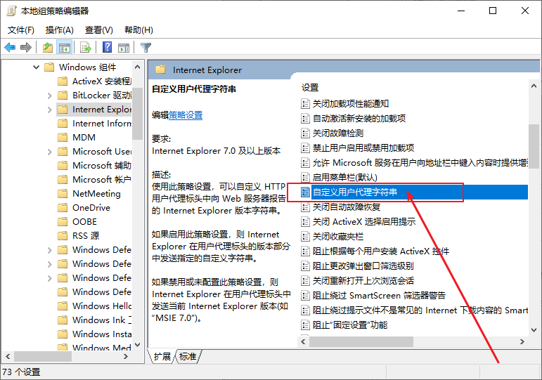 4、隨后,繼續(xù)在右側(cè)找到“自定義用戶代理字符串”并雙擊打開