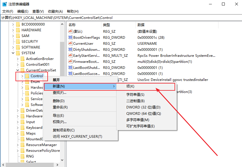 3、右擊Control文件夾,選擇新建一個(gè)名為StorageDevicePolicies的項(xiàng)