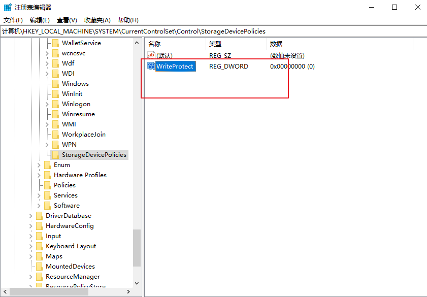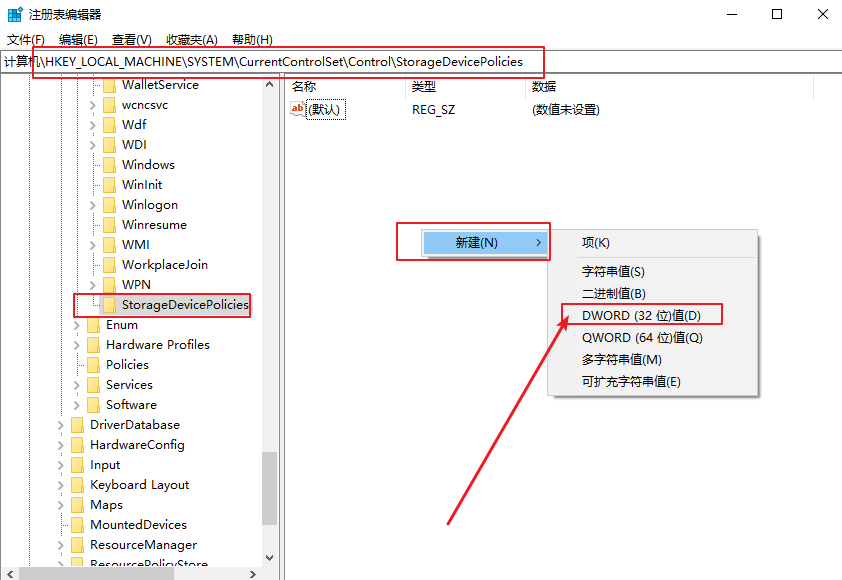 4、點(diǎn)擊StorageDevicePolicies項(xiàng),并在右側(cè)新建一個(gè)名為WriteProtect的DWORD(32位)值