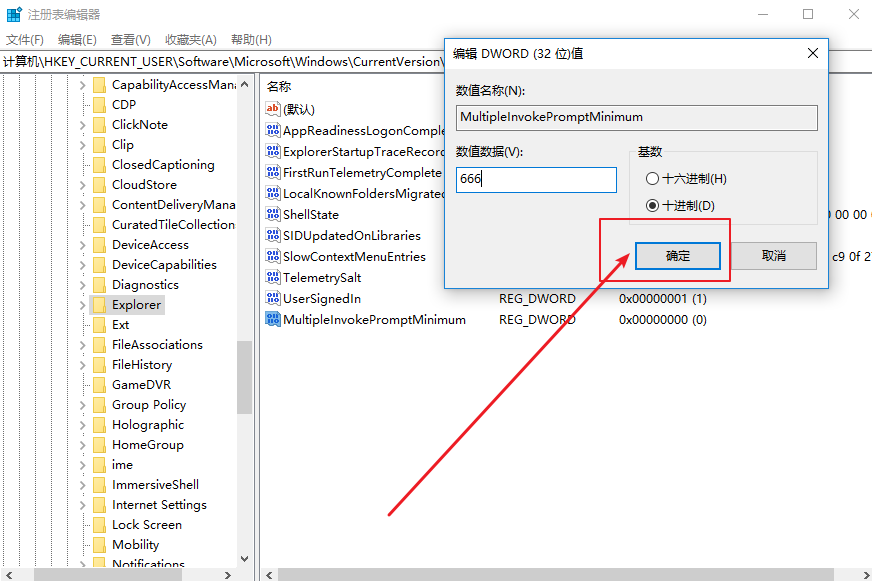2、定位到:HKEY_CURRENT_USER\Software\Microsoft\Windows\CurrentVersion\Explorer,新建DWORD(32位)值,命名為MultipleInvokePromptMinimum;