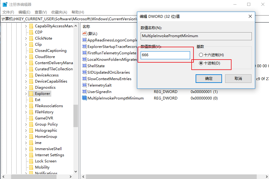 3、雙擊修改數(shù)值數(shù)據(jù),注意選擇數(shù)據(jù)格式為“十進(jìn)制”,然后輸入你想啟用完整右鍵菜單的文件數(shù)量,比如 “666”;