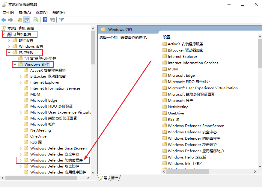 2、在打開的本地組策略編輯器窗口中,展開至計(jì)算機(jī)管理-管理模板-Windows組件-Windows Defender防病毒程序