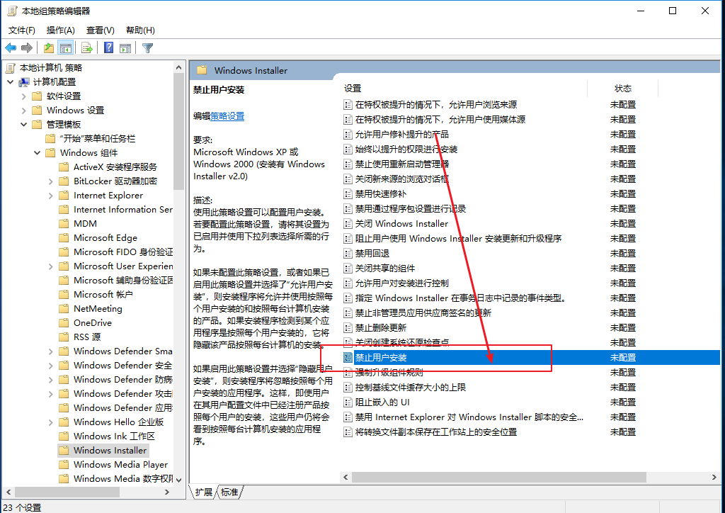 4、 點擊選中Windows Installer后,在右側(cè)窗口,找到“禁止用戶安裝”選項