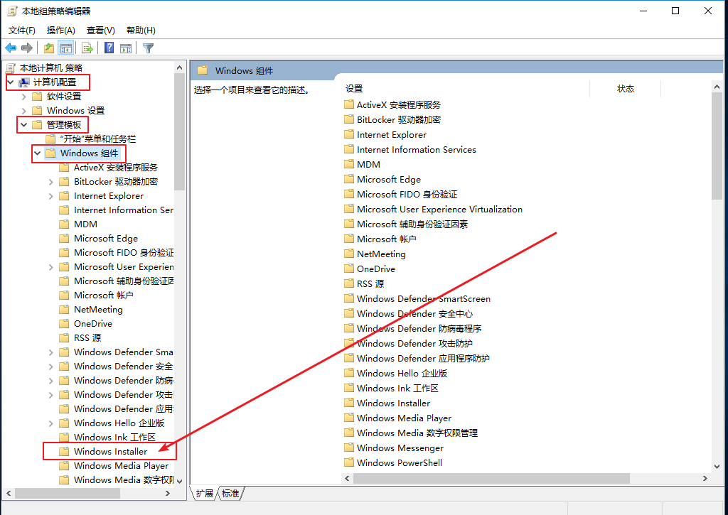 3、 然后,點擊【計算機配置】-【管理模塊】-【W(wǎng)indows組件】-【W(wǎng)indows Installer】
