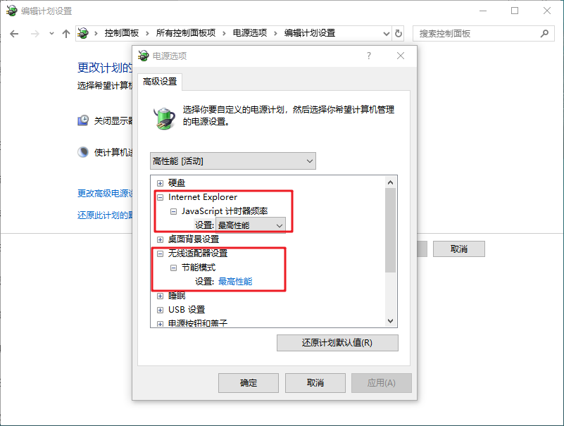 6、在電源選項界面中,將Internet Explorer和無線適配器設(shè)置為【最高性能】;