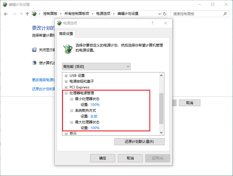 7、再將“處理器電源管理”中的最小處理器狀態(tài)調(diào)整為【100%】,系統(tǒng)散熱方式調(diào)整為【主動】,最大處理器狀態(tài)調(diào)整為為【100%】;