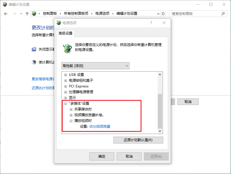 8、最后,設(shè)置“多媒體設(shè)置”下方的“播放視頻時”為【優(yōu)化視頻質(zhì)量】,并點擊“確定”保存即可。