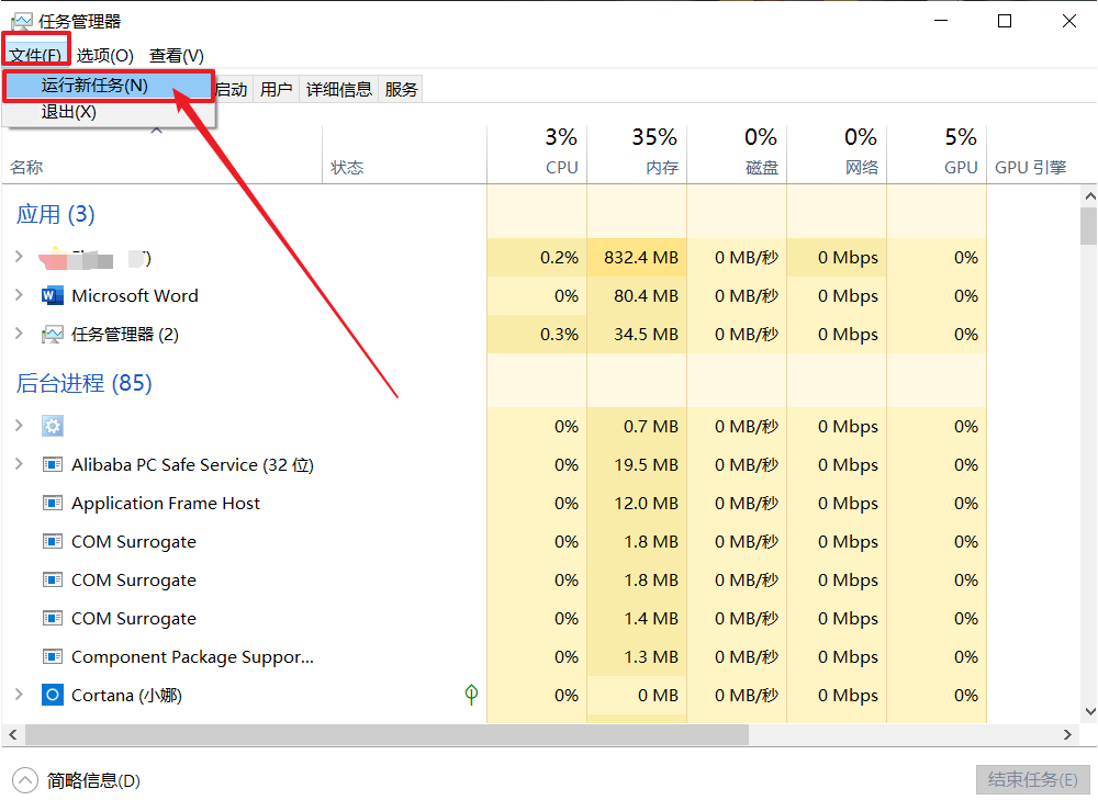 2、在任務(wù)管理器的界面,選擇【文件】-【運(yùn)行新任務(wù)】;