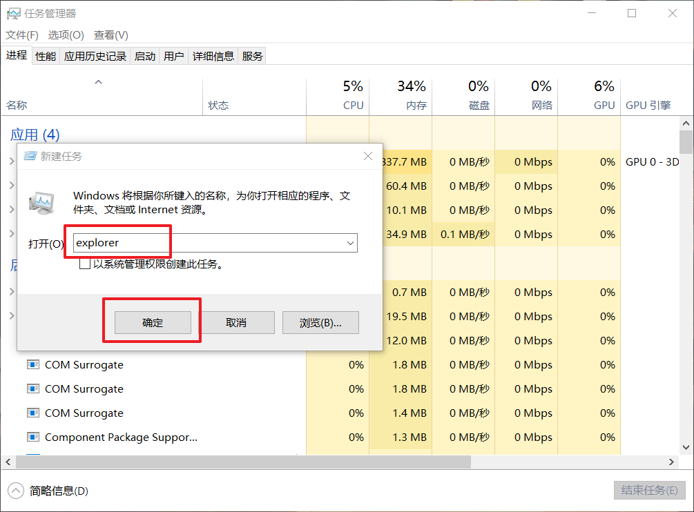 3、在運(yùn)行命令中輸入【explorer】,按確定完成操作;