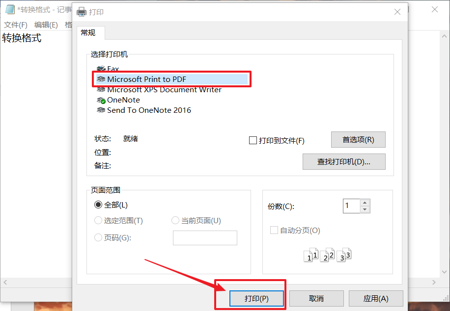 2、隨后,點擊選擇“Microsoft print to PDF”,然后點擊“打印”按鈕。