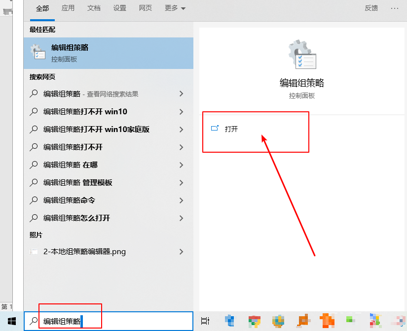 1、在Cortana搜索欄輸入“編輯組策略”,然后點(diǎn)擊“打開”進(jìn)入;
