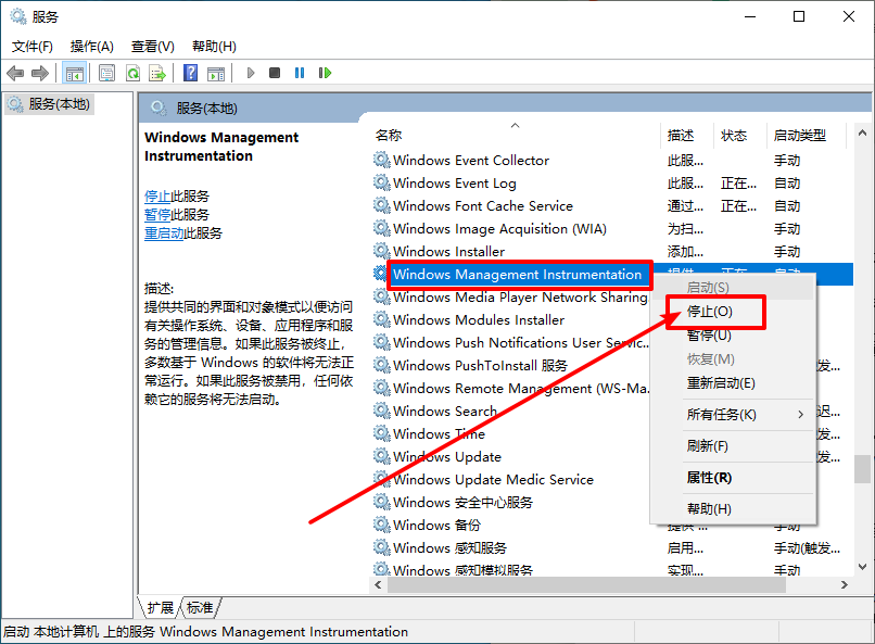 2、然后,在右側(cè)頁(yè)面找到并右鍵Windows Management Instrumentation服務(wù),點(diǎn)擊“停止”即可