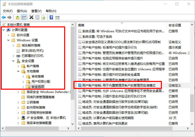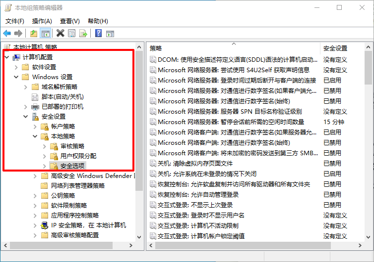 3、彈出本地組策略編輯器后,依次點擊【計算機配置】→【W(wǎng)indows設(shè)置】→【安全設(shè)置】→【本地策略】→【安全選項】
